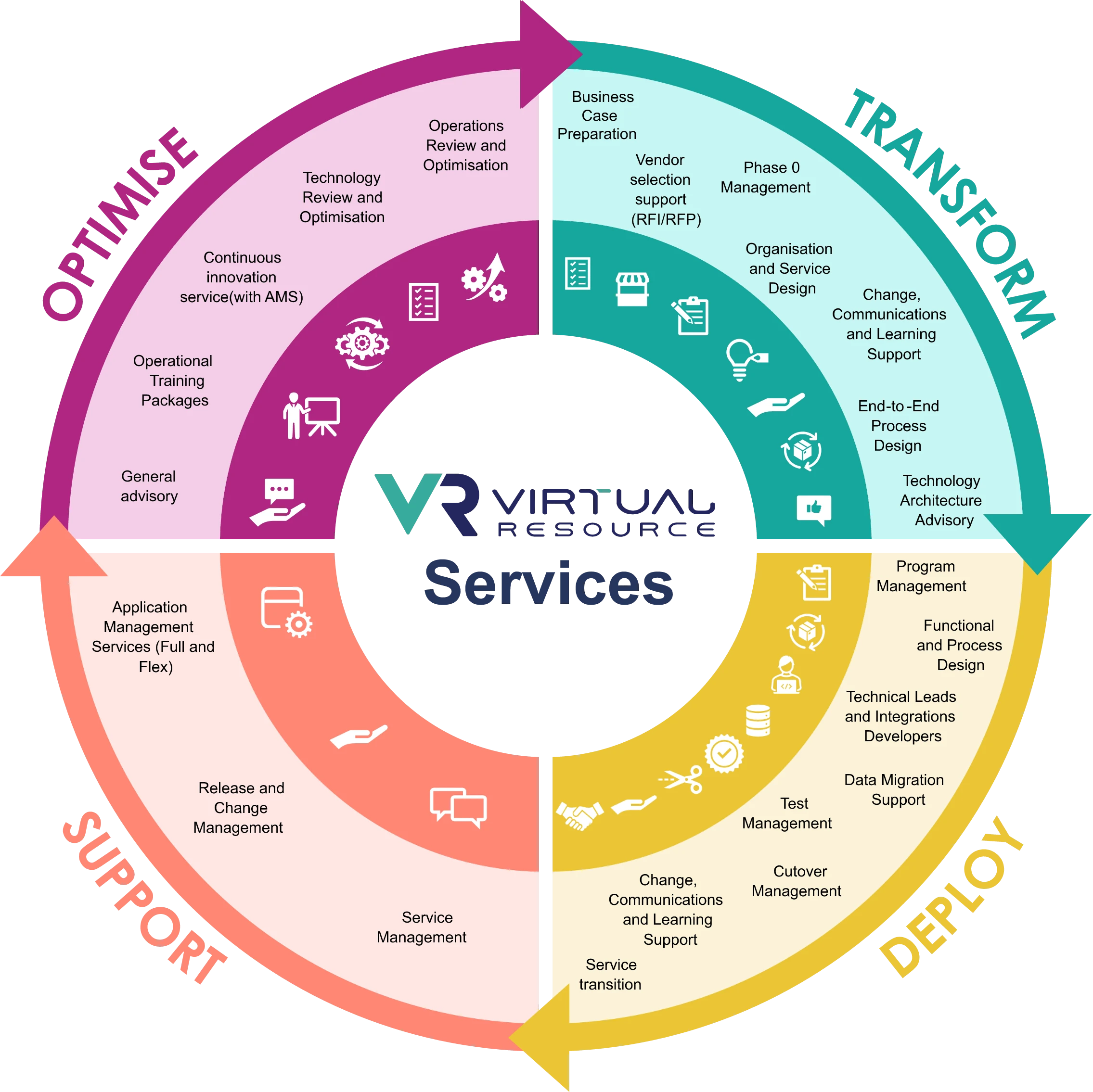 From business case preparation and Phase 0 to deployment, support and optimisation, we offer end-to-end innovation, technical and HR transformation services.